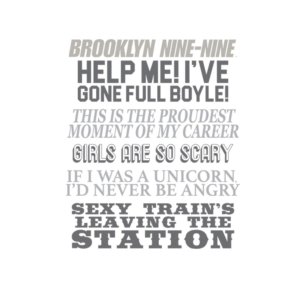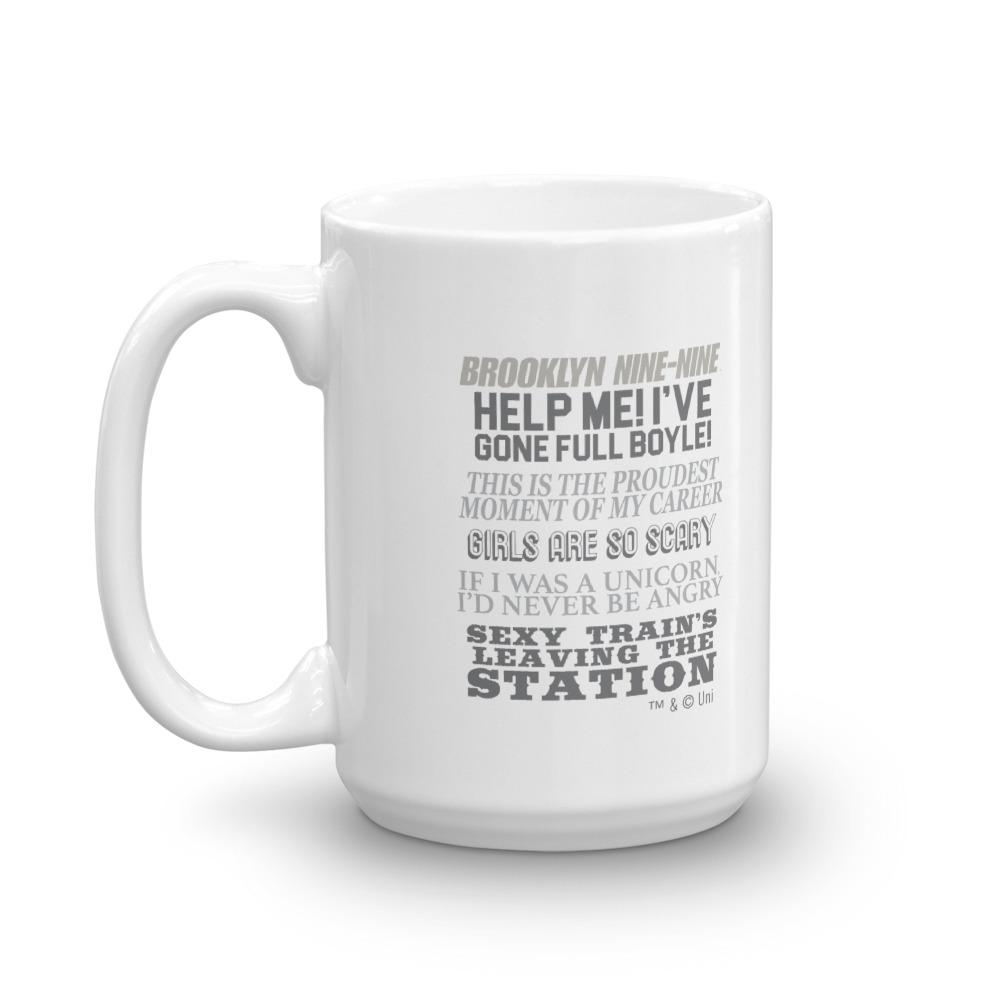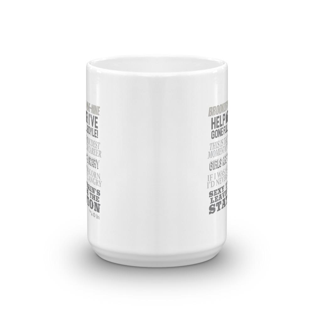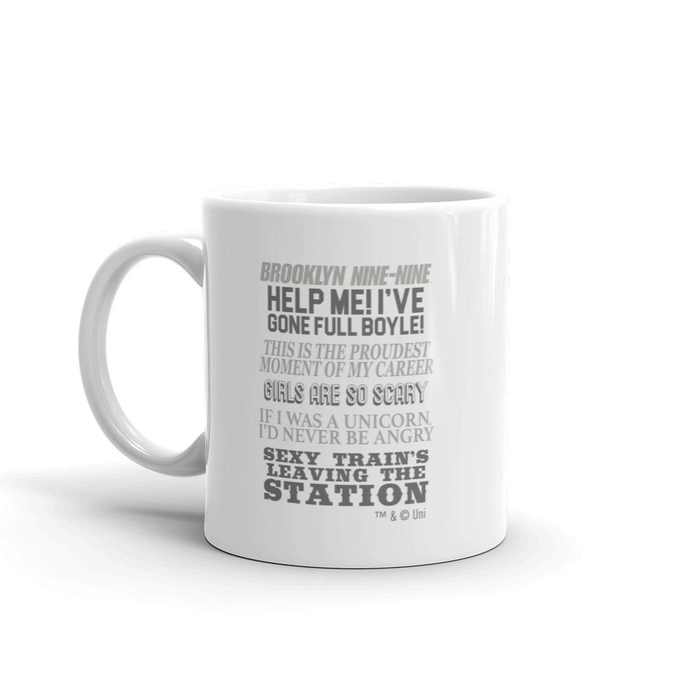 The Brooklyn Nine-Nine Quote Mash-Up design has arrived! This exclusive mug features some of the most memorable and iconic quotes throughout the series. This mug has every reference a die-hard fan could want. Quotes included: Help me! I've gone full Boyle! If I was a Uniicorn I'd never be angry Girls are so scary This is the proudest moment of my career and Sexy train's leaving the station! Relive your favorite memories from Brooklyn Nine-Nine when drinking your morning coffee out of this classic white ceramic mug.