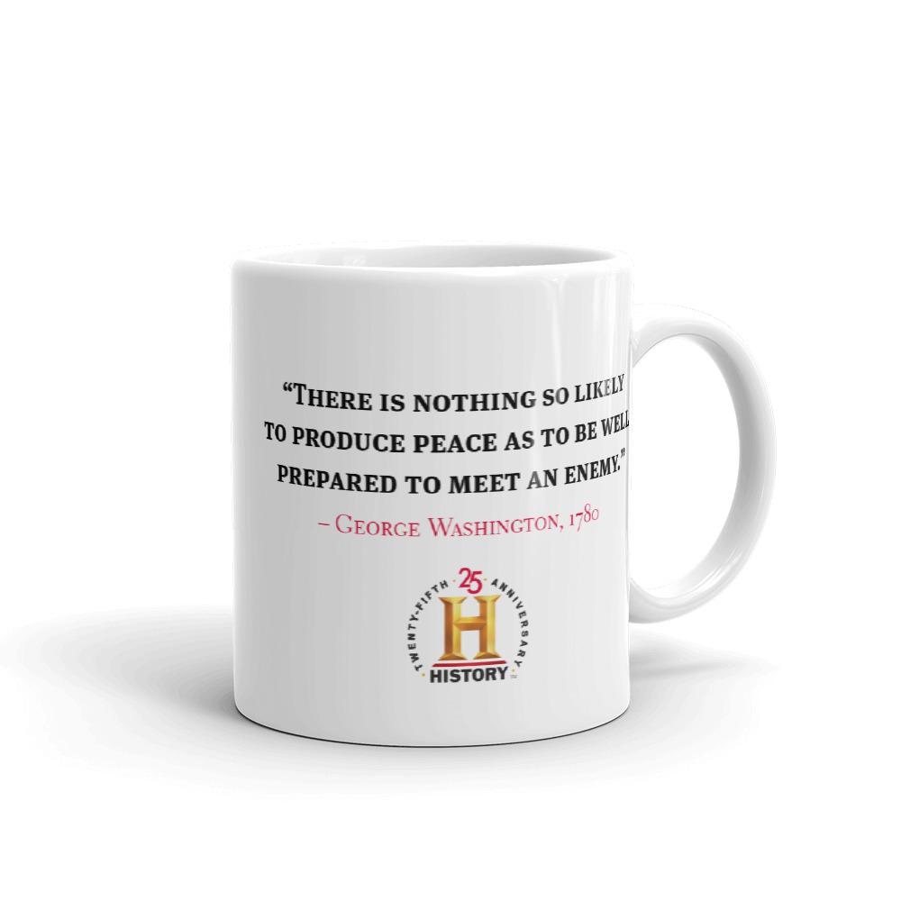 Add a piece of history to your kitchen or office with this George Washington Produce Peace White Mug. Featuring George Washington's quote "There is nothing so likely to produce peace as to be well prepared to meet an enemy" on one side and his portrait and dates of his presidency on the other, this mug will make any history buff smile and, maybe, remind them not to run out of their favorite beverage.