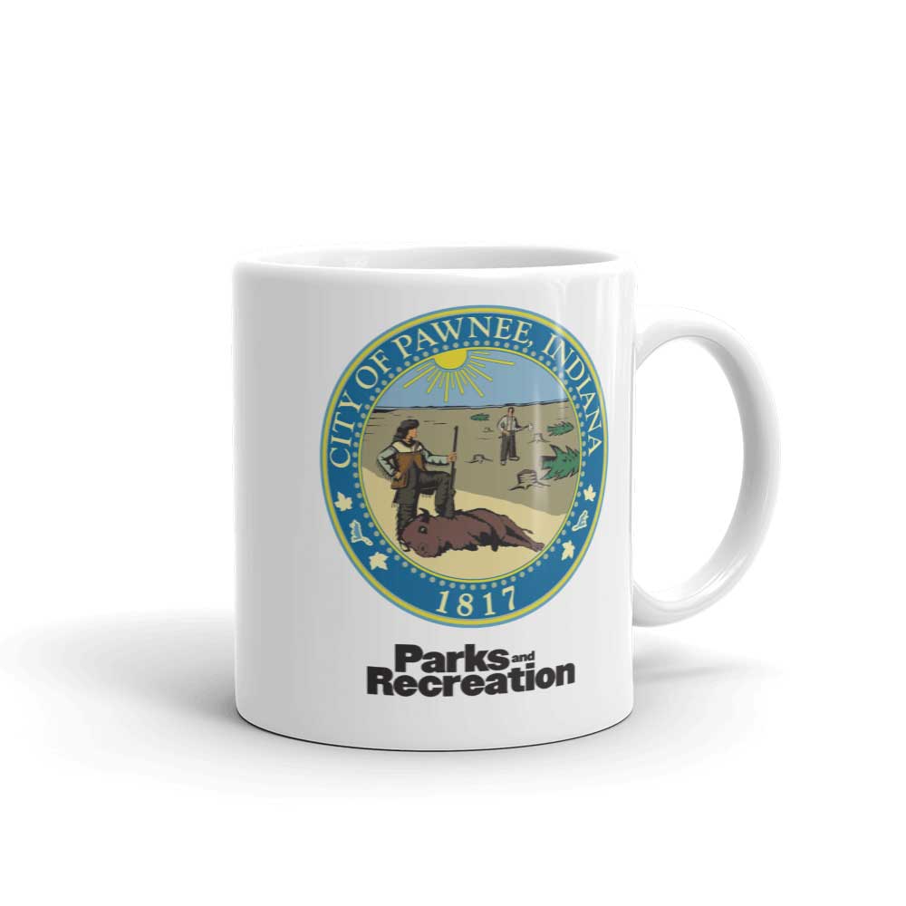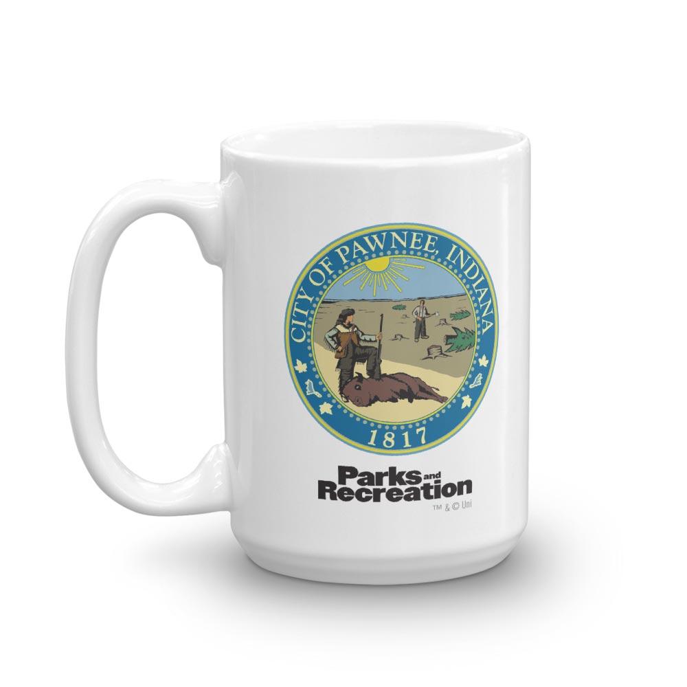 Love the colorful town of Pawnee? Need a souvenir from your seasons-long trips with Leslie Ron and the gang? Look no further. Show pride in your favorite fake Indiana locale with this Pawnee Seal Parks and Recreation ceramic mug from the NBC store.