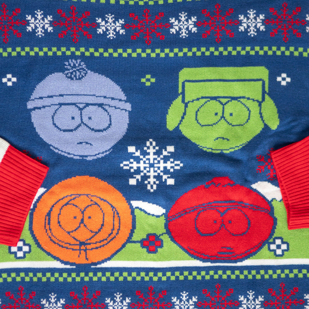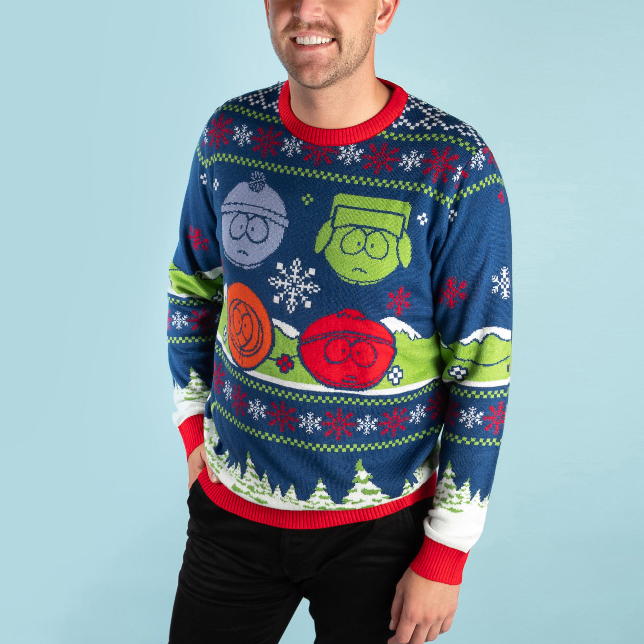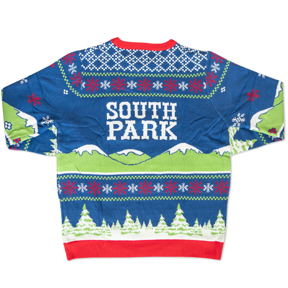 This South Park Boys Ugly Holiday Sweater will get you into the holiday spirit faster than Cartman can eat a sheet of Christmas cookies. Yeah, that fast. Featuring Stan Marsh, Kyle Broflovski, Eric Cartman, and Kenny McCormick on the front and the South Park logo on the back, this South Park Boys Ugly Holiday Sweater lets you stroll into any office party, Secret Santa gift exchange, or holiday dinner in ultimate style and comfort. This South Park Boys Ugly Holiday Sweater also makes a great gift for South Park fans this holiday season.