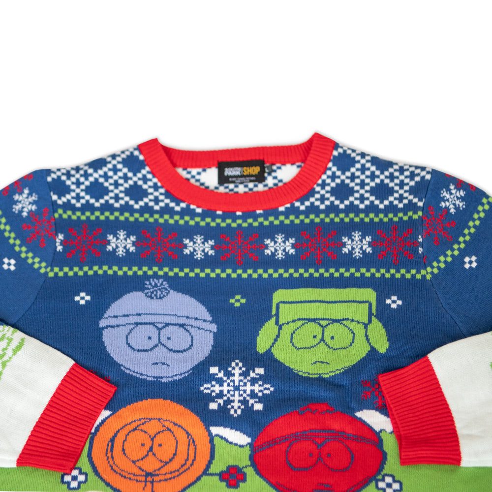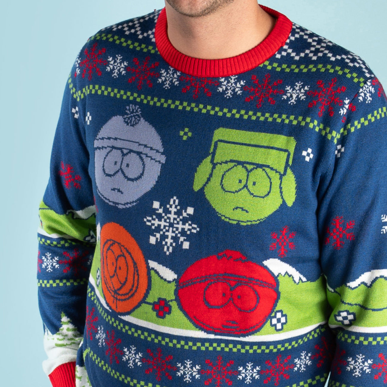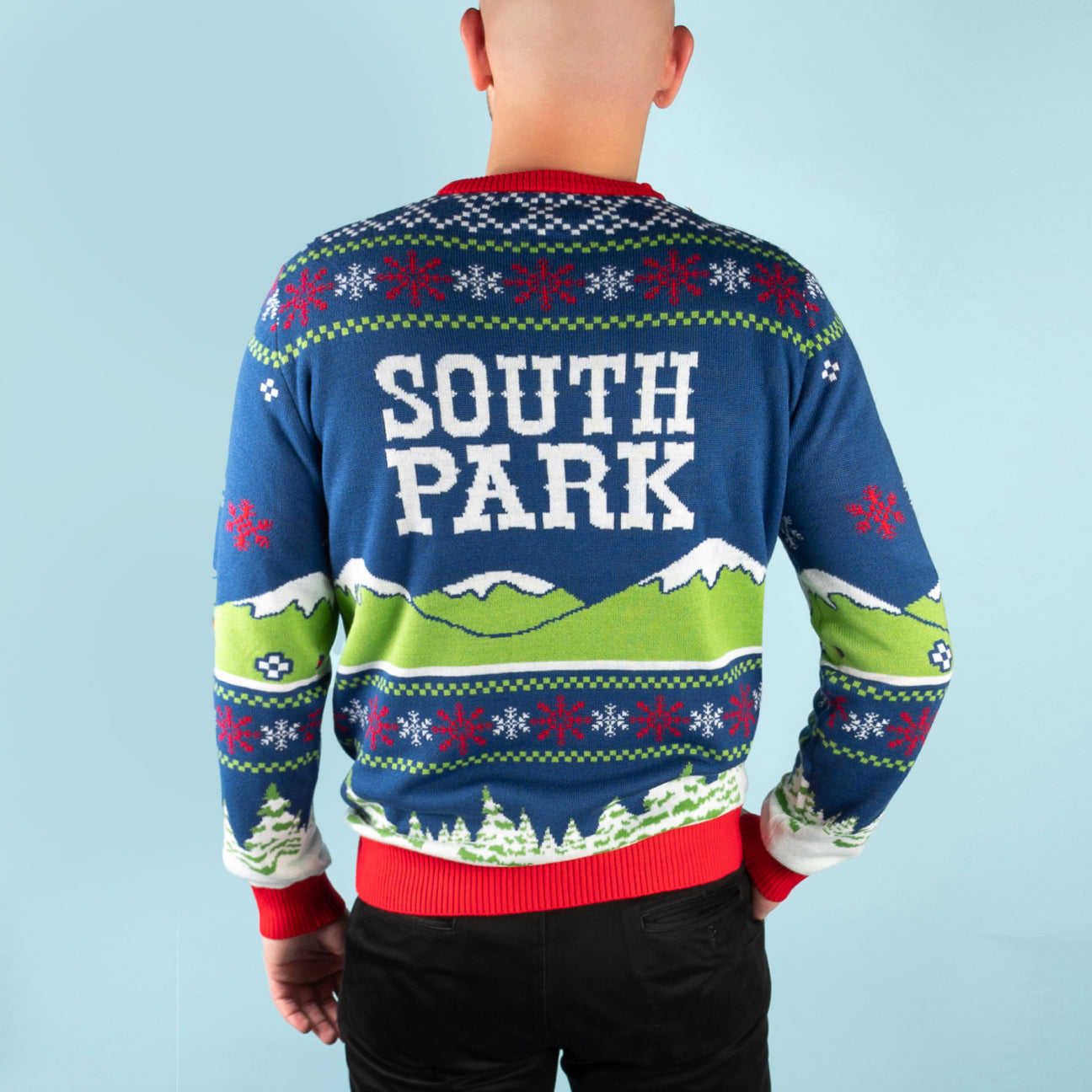 This South Park Boys Ugly Holiday Sweater will get you into the holiday spirit faster than Cartman can eat a sheet of Christmas cookies. Yeah, that fast. Featuring Stan Marsh, Kyle Broflovski, Eric Cartman, and Kenny McCormick on the front and the South Park logo on the back, this South Park Boys Ugly Holiday Sweater lets you stroll into any office party, Secret Santa gift exchange, or holiday dinner in ultimate style and comfort. This South Park Boys Ugly Holiday Sweater also makes a great gift for South Park fans this holiday season.