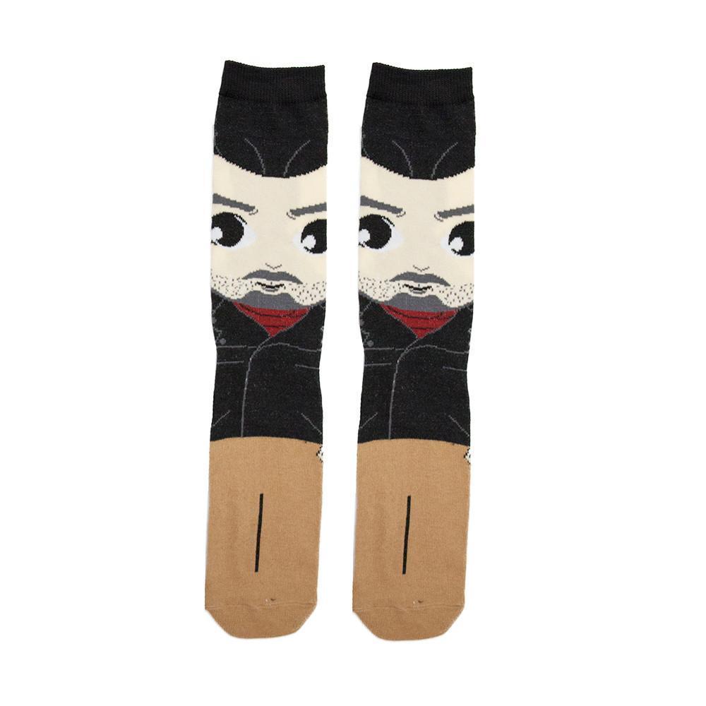 Quick on his feet, Negan has dodged every attack and attempt to take him out. With his vast power, army of underlings and ability to control people with fear, Negan seems impervious to any harm. Not to say these socks will do that for you but you never know. These socks feature Negan from the AMC television series, The Walking Dead.