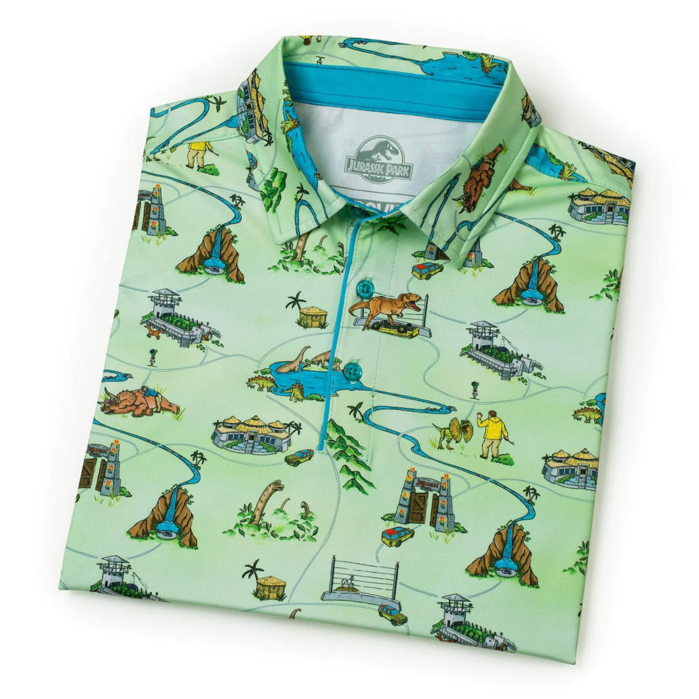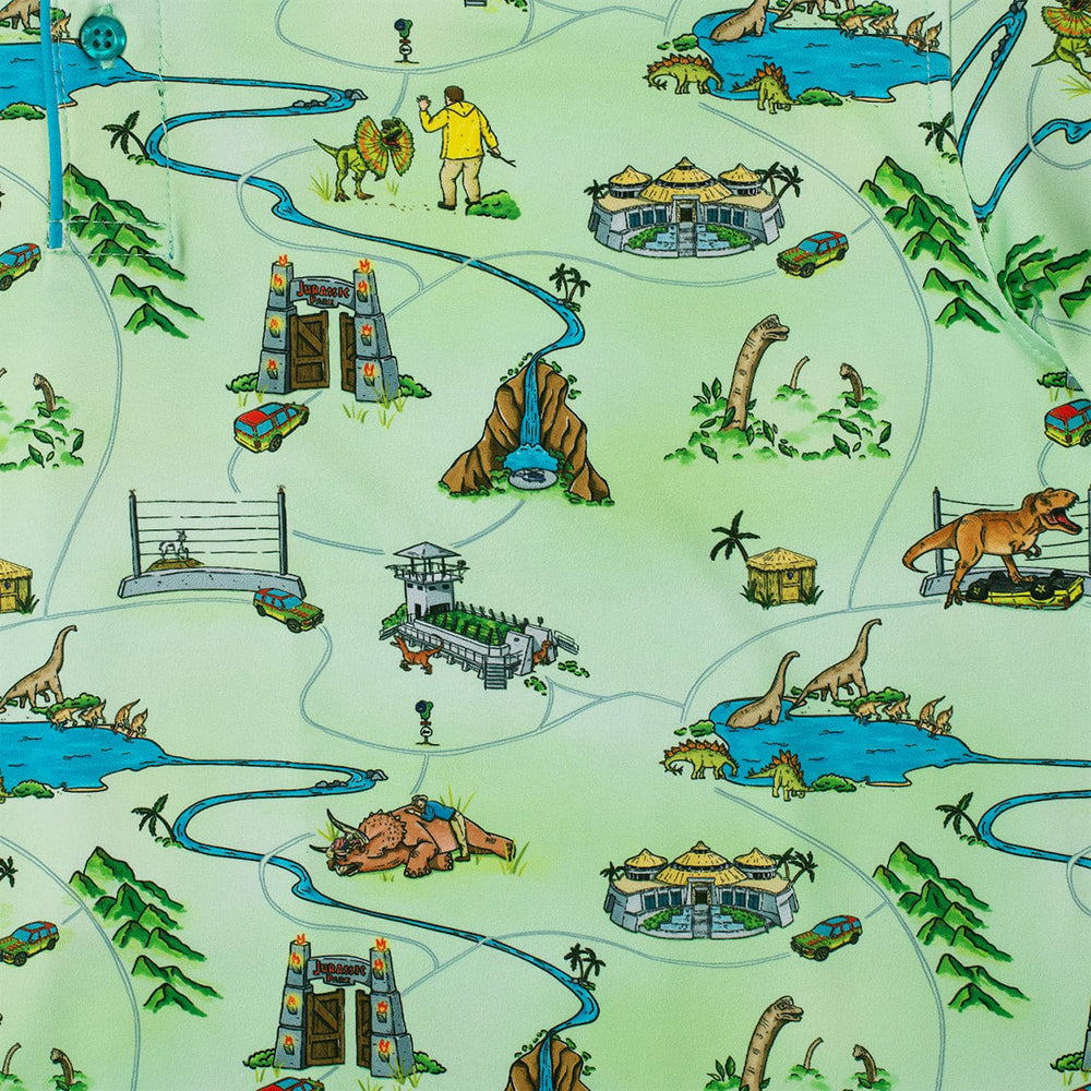 Ah, Jurassic Park on Isla Nublar - a wonderful attraction for kids and families alike. Be sure to grab a park map on the way in for a self-guided tour of idyllic helipads, majestic front gates, a spitting dilophosaurus, some escaped velociraptors, and the *ahem* impenetrable fences of the T. rex paddock (and the goats who hang out near it). And if you don't get yourself a park map, just gaze down at this beautifully informative montage of a shirt and find your way.