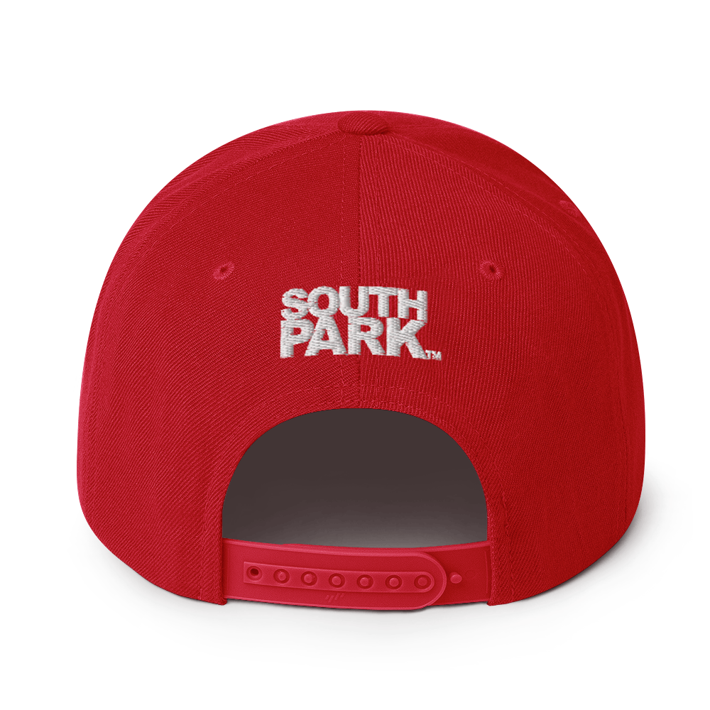 Whether you're out picking up Cheesy Poofs or in playing World of Warcraft with your friends, this South Park Cartman Embroidered Flat Bill Hat shows the world that you are the #1 Eric Cartman fan. Featuring Cartman's face embroidered against a red background, this flat bill hat is the perfect finishing touch to any style.