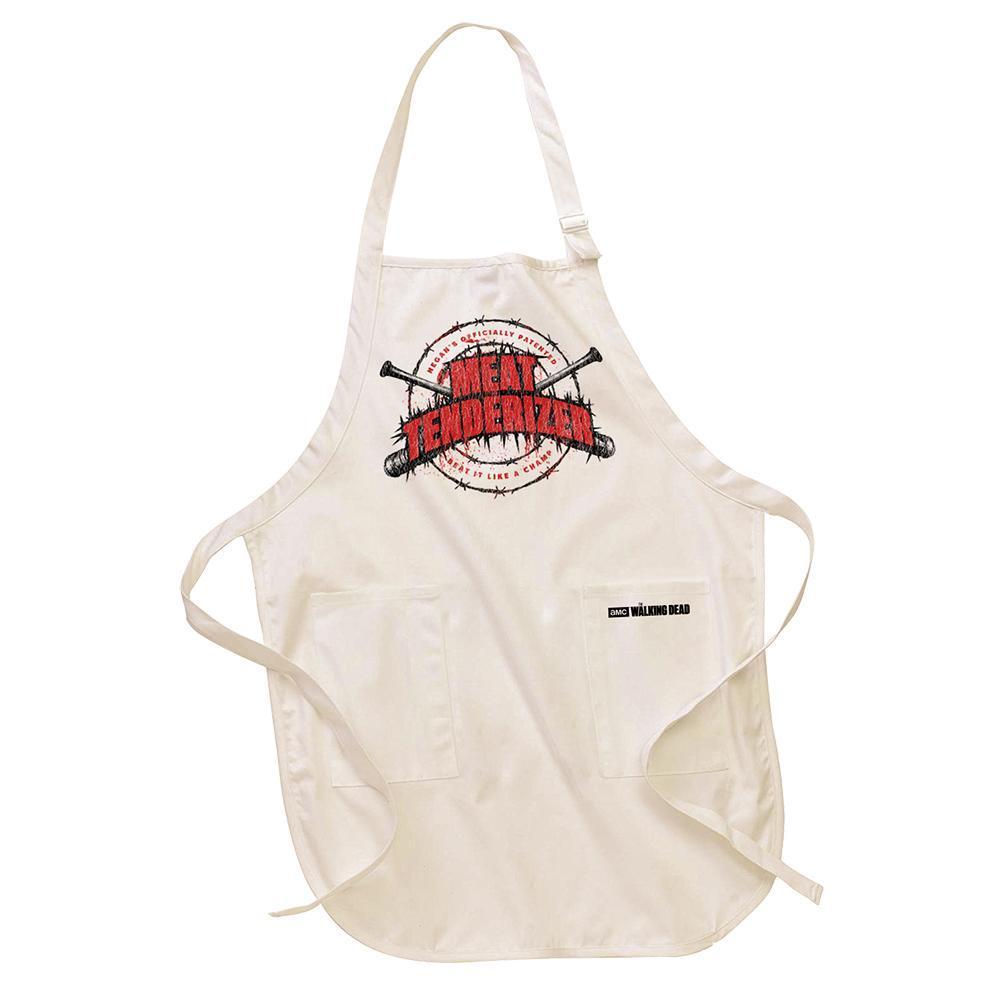 Cooking for fans of The Walking Dead? Impress them with your insane culinary skills and your pop culture style with this Meat Tenderizer apron! Featuring the phrase "Meat Tenderizer" in large, bold red lettering, this ShopTheWalkingDead.com exclusive white apron comes with a killer graphic of Negan's bat Lucille and the phrase "Beat it Like a Champ." Printed in California, USA.