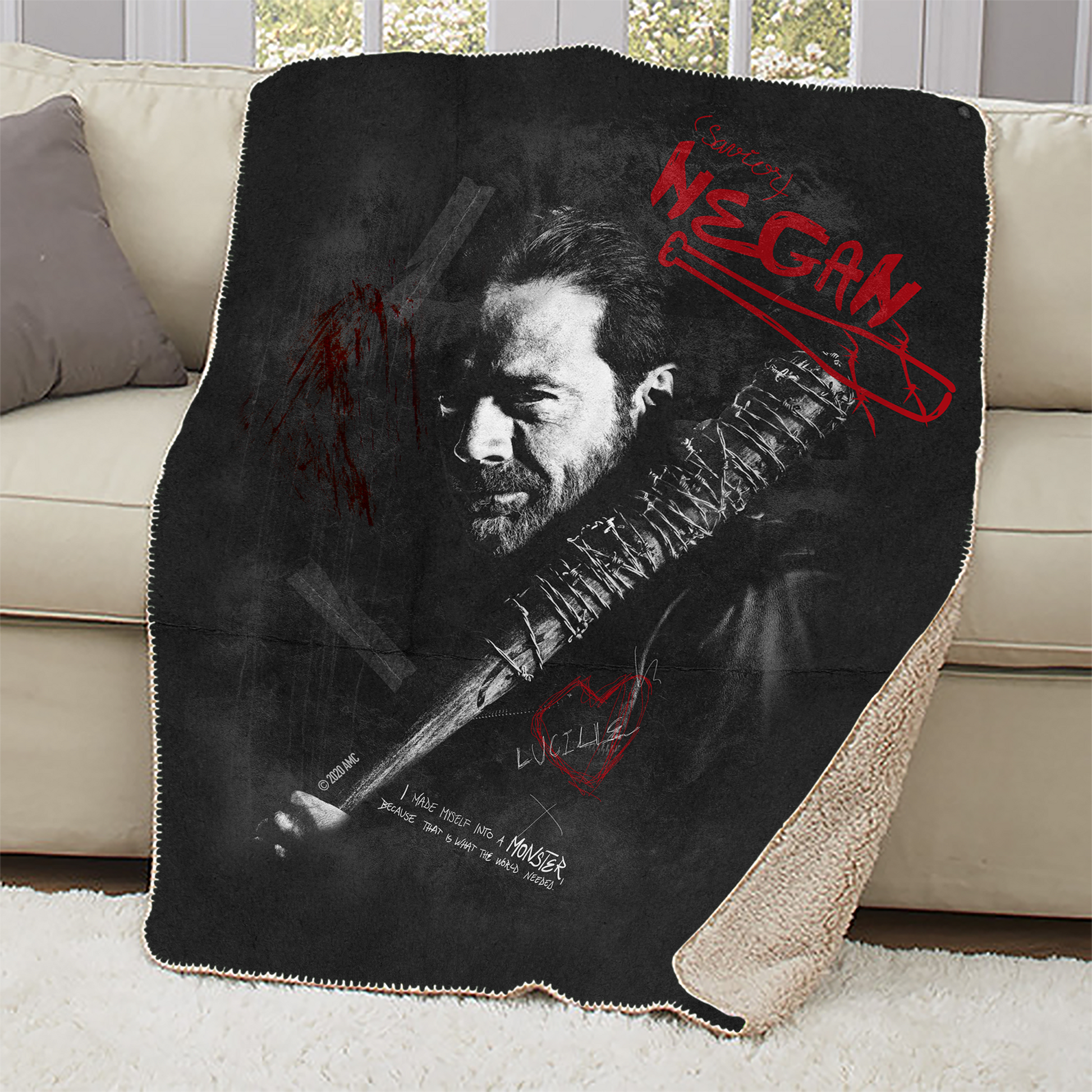 Cozy, comfy, and wickedly soft, this The Walking Dead Negan Graffiti Sherpa Blanket makes your marathons of The Walking Dead that much better. This sherpa blanket also makes a great housewarming gift to the biggest fans of Negan and The Walking Dead.