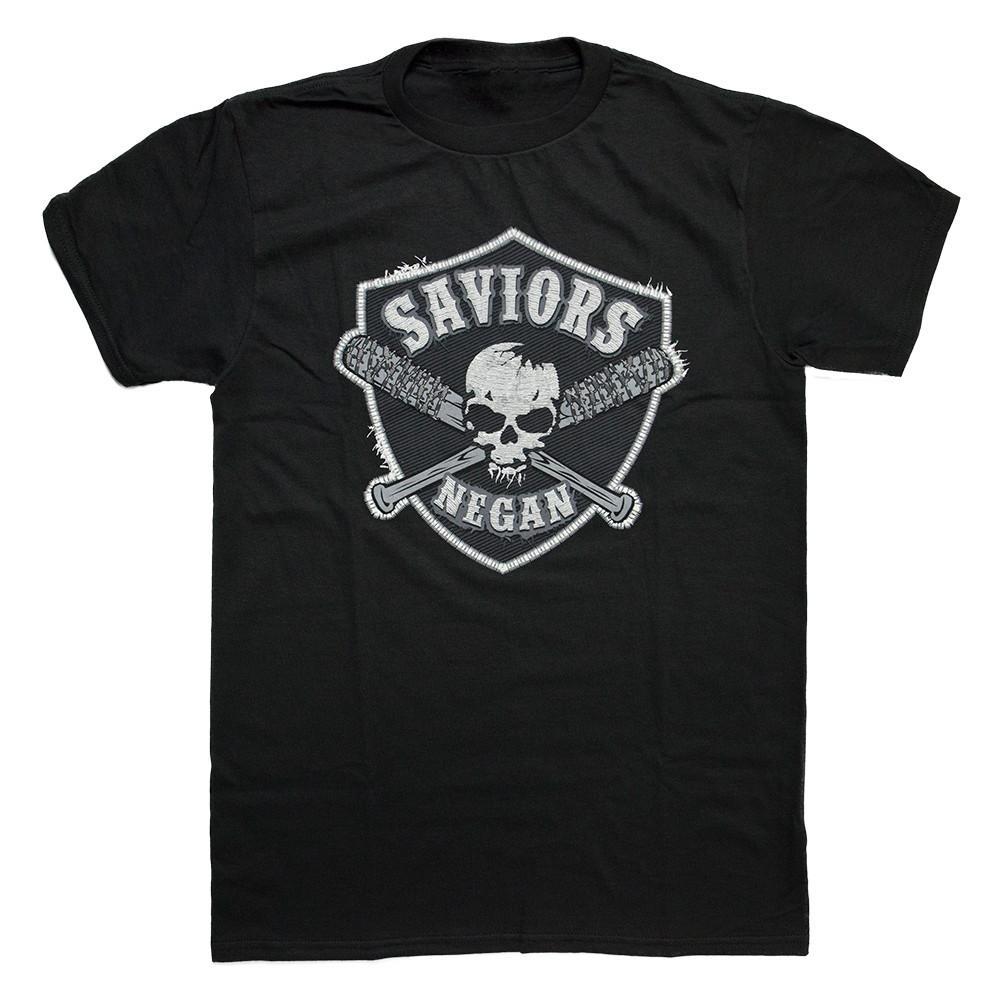 The Saviors aren't exactly the nicest guys on The Walking Dead, but when you're trying to survive in a zombie-ravaged wasteland, you don't always get to pick your friends. If you want to cast your lot in with Negan and his gang, throw on this stylish T-shirt proclaiming your allegiance. Just don't let Rick Grimes and his pals see you in it! This shirt is available in adult sizes. Machine Washable.