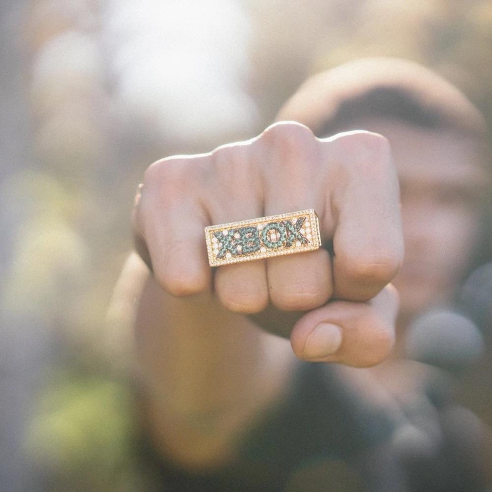Paying homage to the classic XBOX logo, this two-finger ring makes a statement. Spanning half of the fist each ring is plated in 14K Gold and features green and white stones.